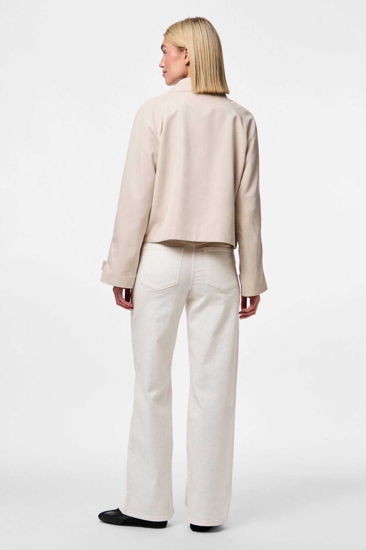 PIECES har med Scarlett Kort Trenchcoat skabt en jakke, der kombinerer klassiske trenchcoat-elementer med et moderne snit. Den kortere længde giver et friskt pust til det traditionelle design og gør jakken utrolig alsidig.
